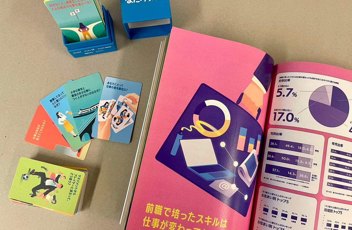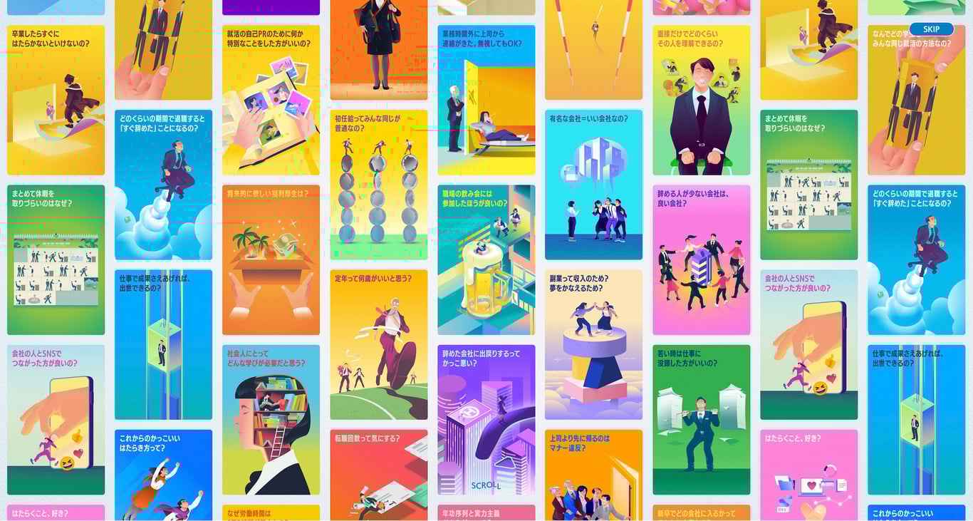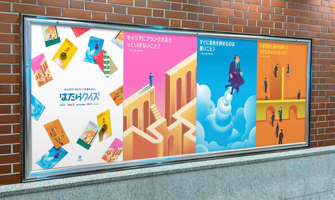 "HATARAQUIZ" is an interactive project by Persol Career ltd. Japan, featuring 100 illustrated questions about Japanese work culture. It invites people to reflect on and challenge norms around “hataraku” (working), encouraging new perspectives and more personal, sustainable ways of working. - How were your illustrations used?