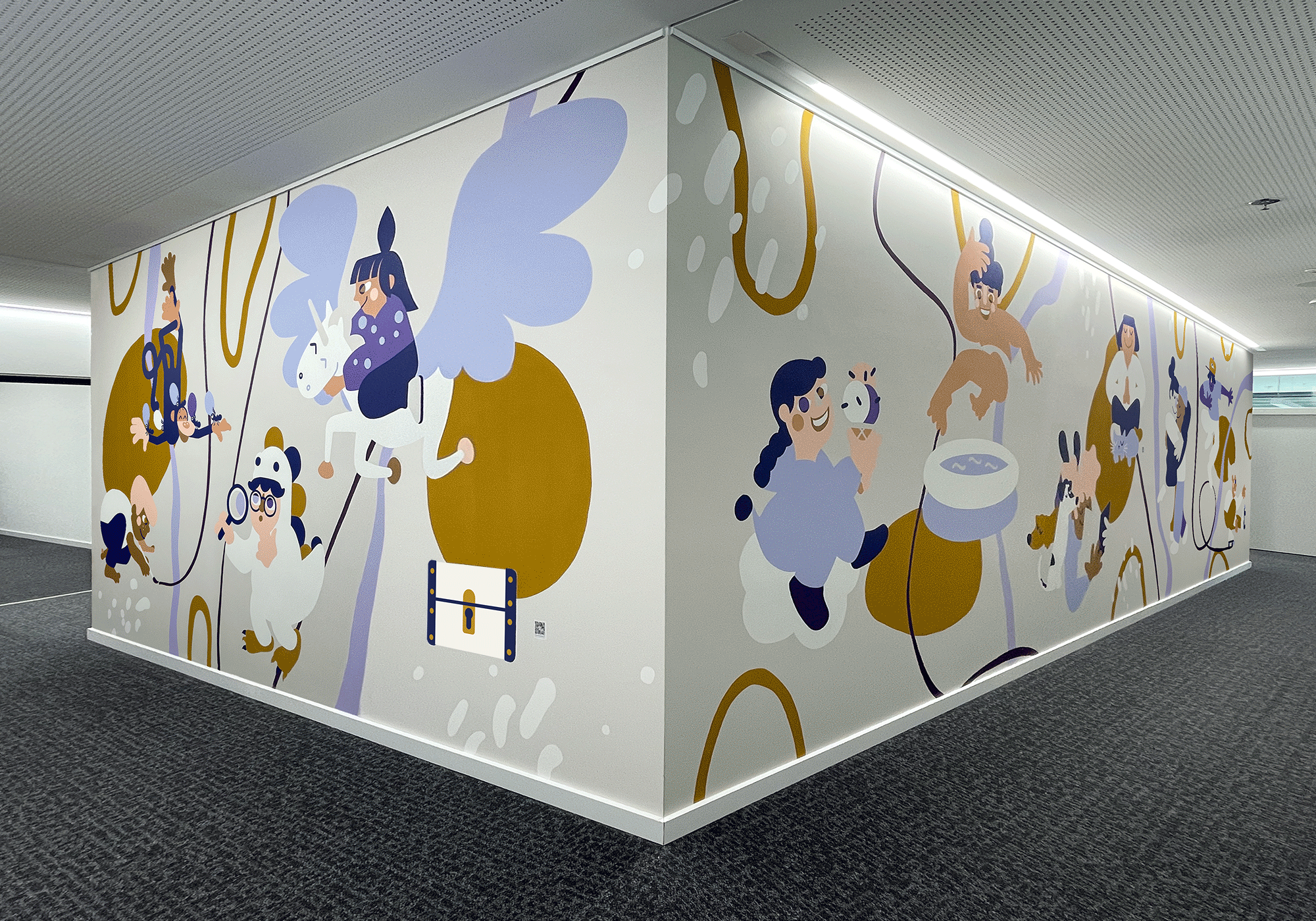I started with simple pencil sketches, turned them into vector illustrations and transferred the design onto the wall. I used various brushes, paint rollers and indoor wall paint. I used Adobe After Effects for the animations and Adobe Aero for the augmented reality feature. - Was this project commissioned?