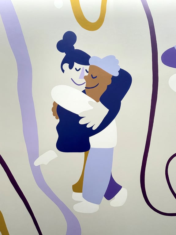 Patients and psychologists use the wall during their sessions to discuss topics such as dreaming, painting, exploring the world, eating habits, body awareness, enjoying life, spending time alone, meditating, friendship, dancing, and sports. In 2024, the illustrations will serve as the foundation for a guidance system and corporate design. - What materials and techniques did you use?