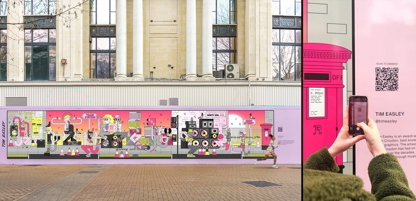 The illustration is primarily used as a mural on a 15m x 3m hoarding covering the front of the old Allders department store in Croydon while renovations are being carried out. In addition to the illustration, an animated version by designer Alex Hill is accessible by the public via a QR code printed on the mural, which encourages community interaction. - What materials and techniques did you use?
