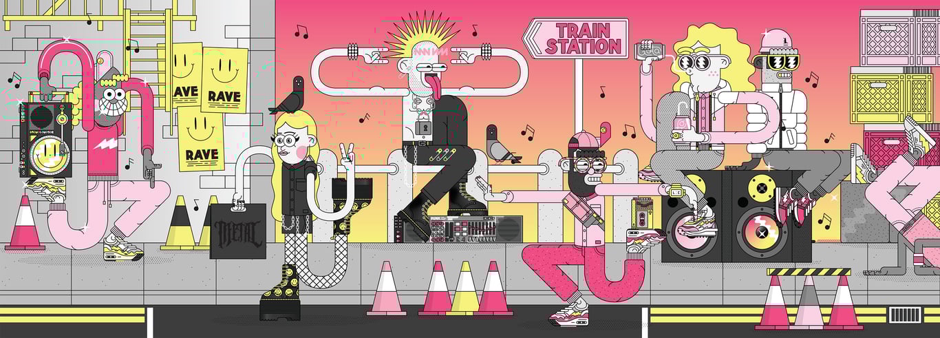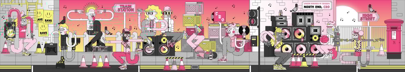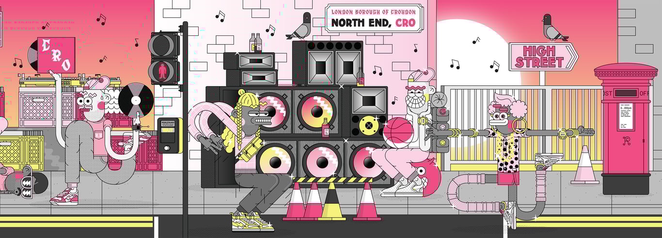 As a born and bred south Londoner based in Croydon, I was commissioned by Laura Nevill to create a new piece of community inspired artwork as part of the Let's Do London Better campaign. Music has heavily influenced my work over the years so I decided to focus on the Croydon music scene, both past and present, celebrating south London's unique mix of styles and cultures. - How were your illustrations used?