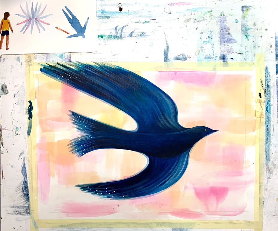 I do all my sketching and painting in a shared art studio and I have a separate setup at home with my computer and A3 scanner for digital editing —I like to keep the two parts of my process separate.