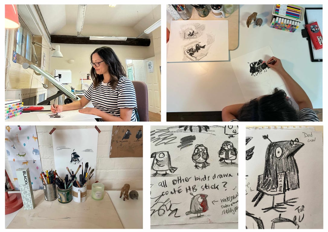 In my animation studio in Chippenham, on a lovely avocado green 1970’s architects’ desk that belonged to my father-in-law. I work both traditionally in mixed media and digitally in procreate.