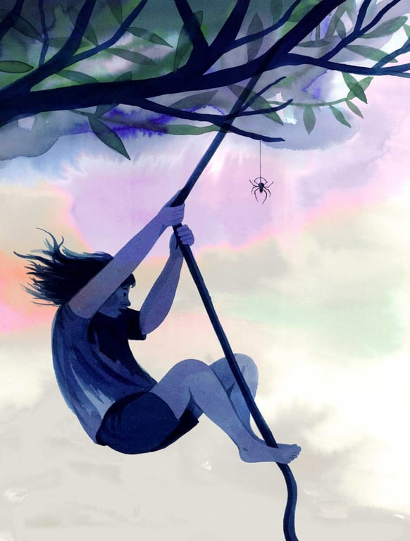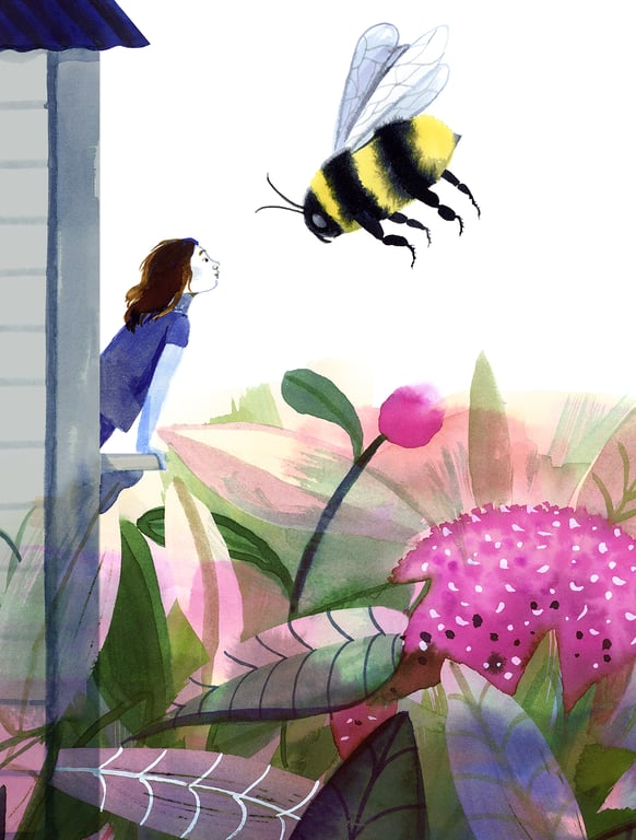 The brief was to illustrate 'Poem For Ataahua' written by Alistair Te Ariki Campbell. My aim was to create a vibrant visual world where a child experiences the natural world at close proximity. She listens in on the private conversations of insects and trees, worms and bees. I used washes of water-colour and inks to highlight the constant and unpredictable movement inherent in the natural world. - How were your illustrations used?